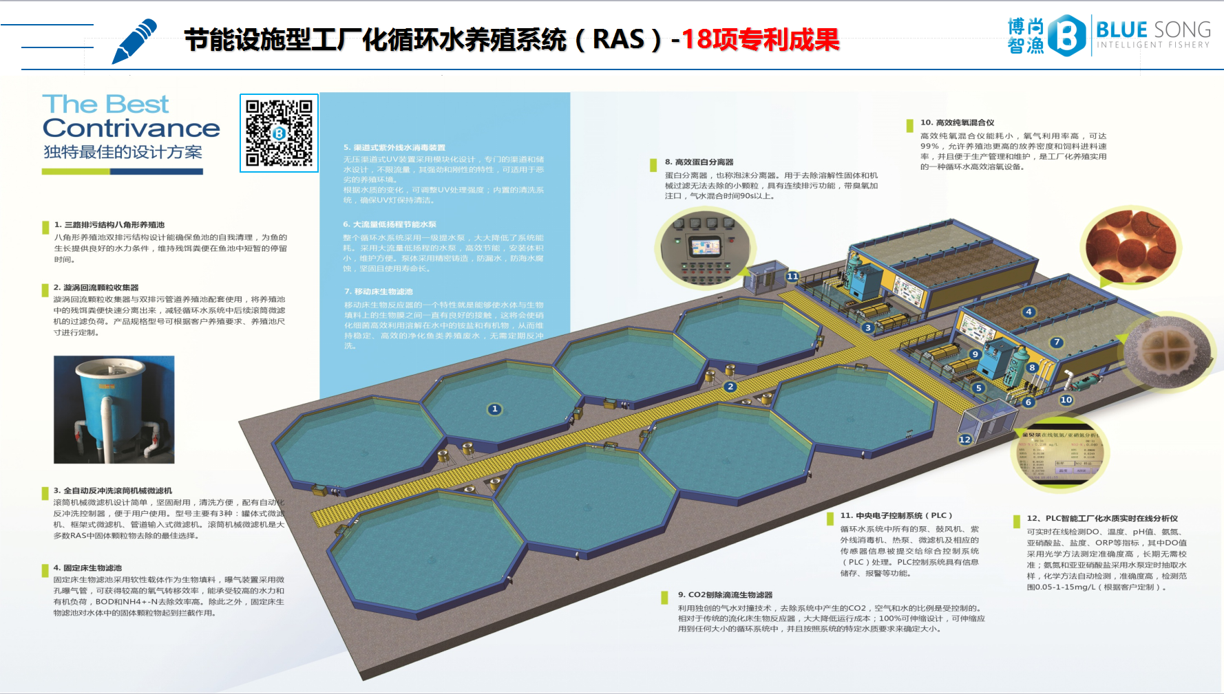 節(jié)能設(shè)施型工廠化循環(huán)水養(yǎng)殖系統(tǒng)基于我司自主研發(fā)的18項(xiàng)專利成果,采用了3種獨(dú)創(chuàng)核心技術(shù),將漩渦固液分離器、全自動反沖洗滾筒機(jī)械微濾機(jī)、移動生物濾床、固定生物濾床、高效紫外線殺菌儀、大流量低揚(yáng)程循環(huán)水泵、CO2刨除滴溜生物濾器、蛋白泡沫分離器、高效純氧混合器、旁路反硝化系統(tǒng)、水質(zhì)實(shí)時在線監(jiān)測系統(tǒng)、PLC中央電子控制系統(tǒng)等集成了獨(dú)特最佳工廠化封閉式循環(huán)水養(yǎng)殖系統(tǒng),工藝可靠、節(jié)能,完整的成套系統(tǒng)設(shè)備,運(yùn)行穩(wěn)定,操作維護(hù)簡單,全自動智能化PLC水處理運(yùn)行技術(shù)。