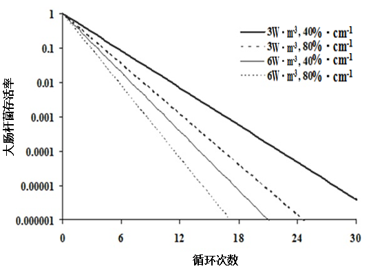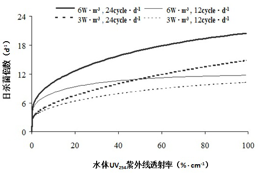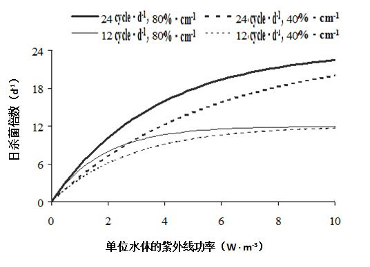 (3)不同失活速率常數的菌種,對于失活速率常數較小的微生物,增大紫外線功率比增加日循環次數更為有效。對于失活速率較大的微生物,前期增大紫外線功率取得較好的殺菌結果,后期則增大日循環次數更有效。